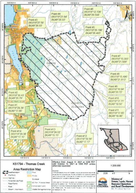 The BC Wildfire Service has implemented an Area Restriction Order for the vicinity of the Thomas Creek Wildfire. The size of the area restriction reflects the continued need to protect the public in areas where there are ongoing fire suppression activities.